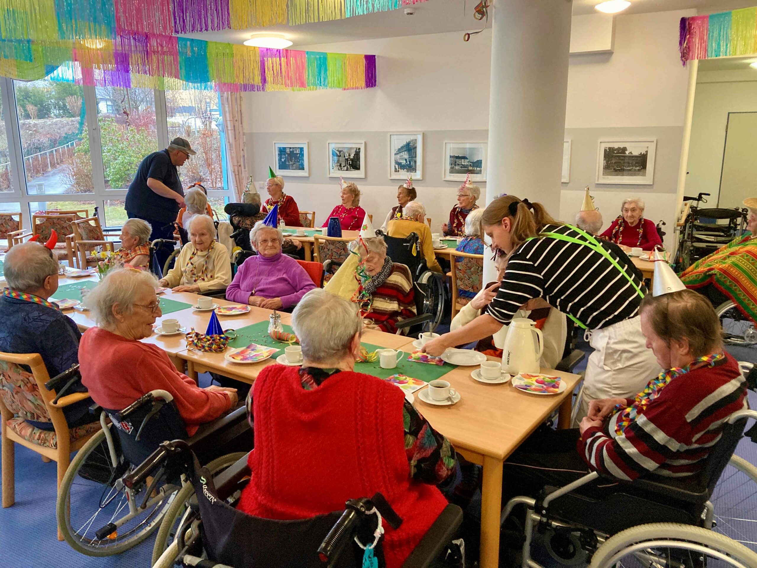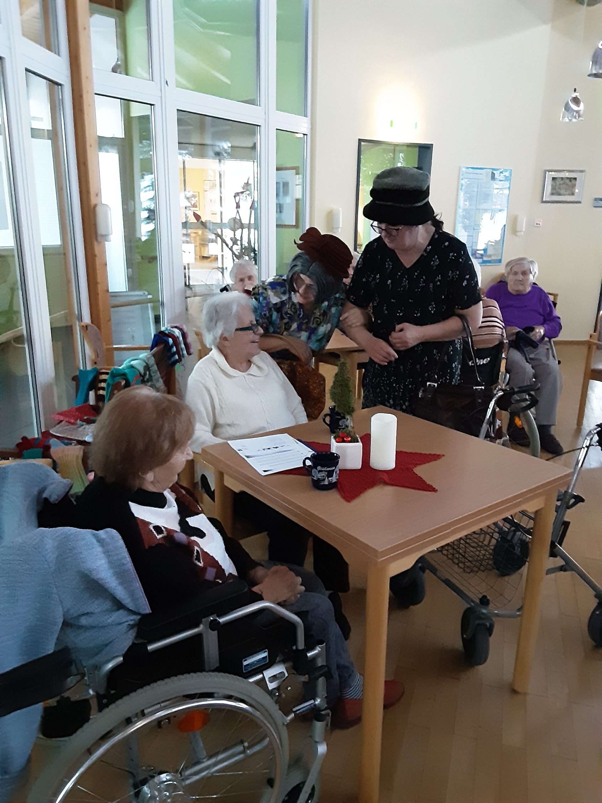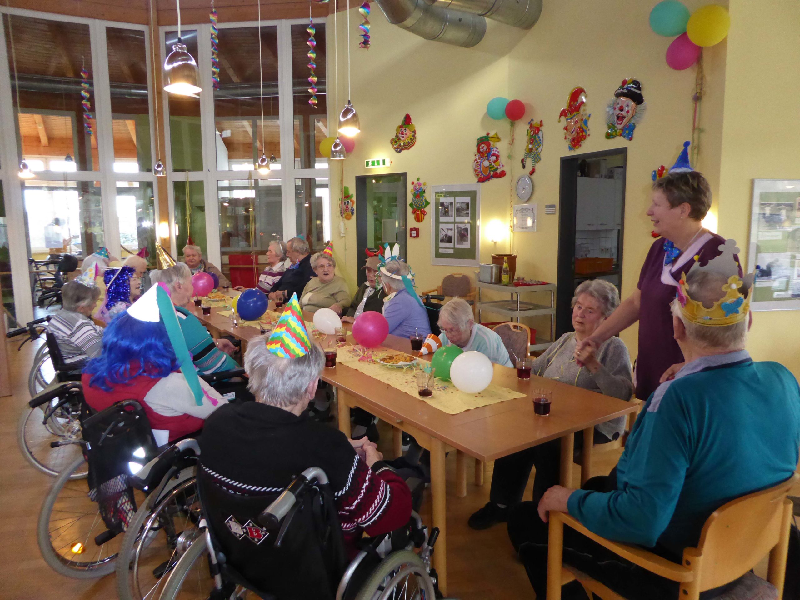 Unsere Faschingsveranstaltung war ein voller Erfolg. Olga und Frieda, alias zwei unserer Mitarbeiterinnen, waren wieder einmal zu Besuch und haben eine Büttenrede zum besten gegeben. Auch unsere Betreuungskraft Elke Rother hat eine Bütt vorgetragen. Es wurde viel getanzt und geschunkelt und auch eine Polonaise durch den Saal gab es. Herr Silberhorn aus Elsterberg hat für Musik und gute Laune gesorgt.