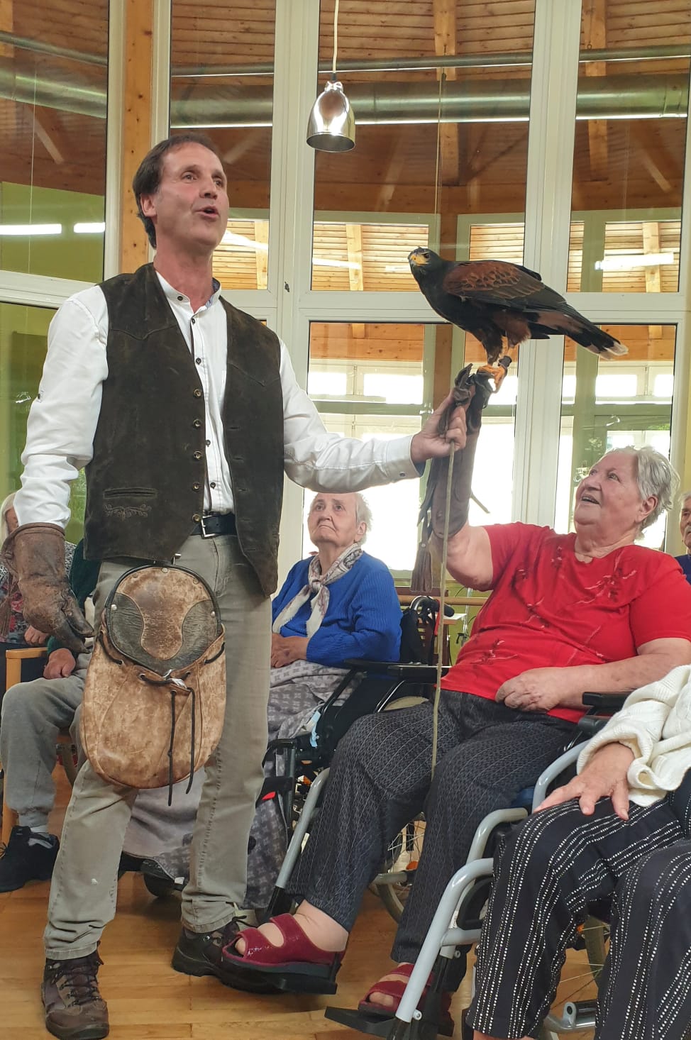 Zu unserem Sommerfest am 28. August gab es eine ganz besondere Attraktion. Für der Seniorenpark „Am Birkenwäldchen“ gab Gerhard Retterath sein Unterhaltungsprogramm „Natur und Jagd“ zum Besten. Dabei durften seine tierischen Helfer natürlich nicht fehlen. Die Tiere konnten auch die Bewohner*innen hautnah erleben. Abgerundet wurde das anschauliche Programm mit sehr lehrreichen Fakten und den musikalischen Klängen der Jagd.