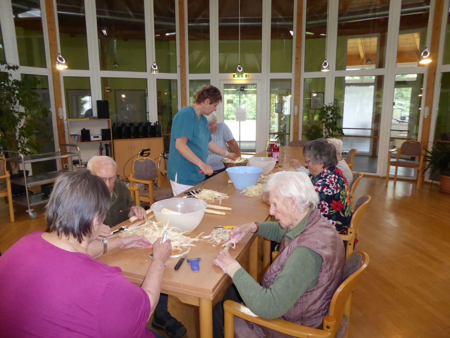 Mit Begeisterung schälten unsere Bewohner*innen Spargel für ein Mittagessen. Aus den Schälern wurde noch eine leckere Spargelcremsuppe gekocht.