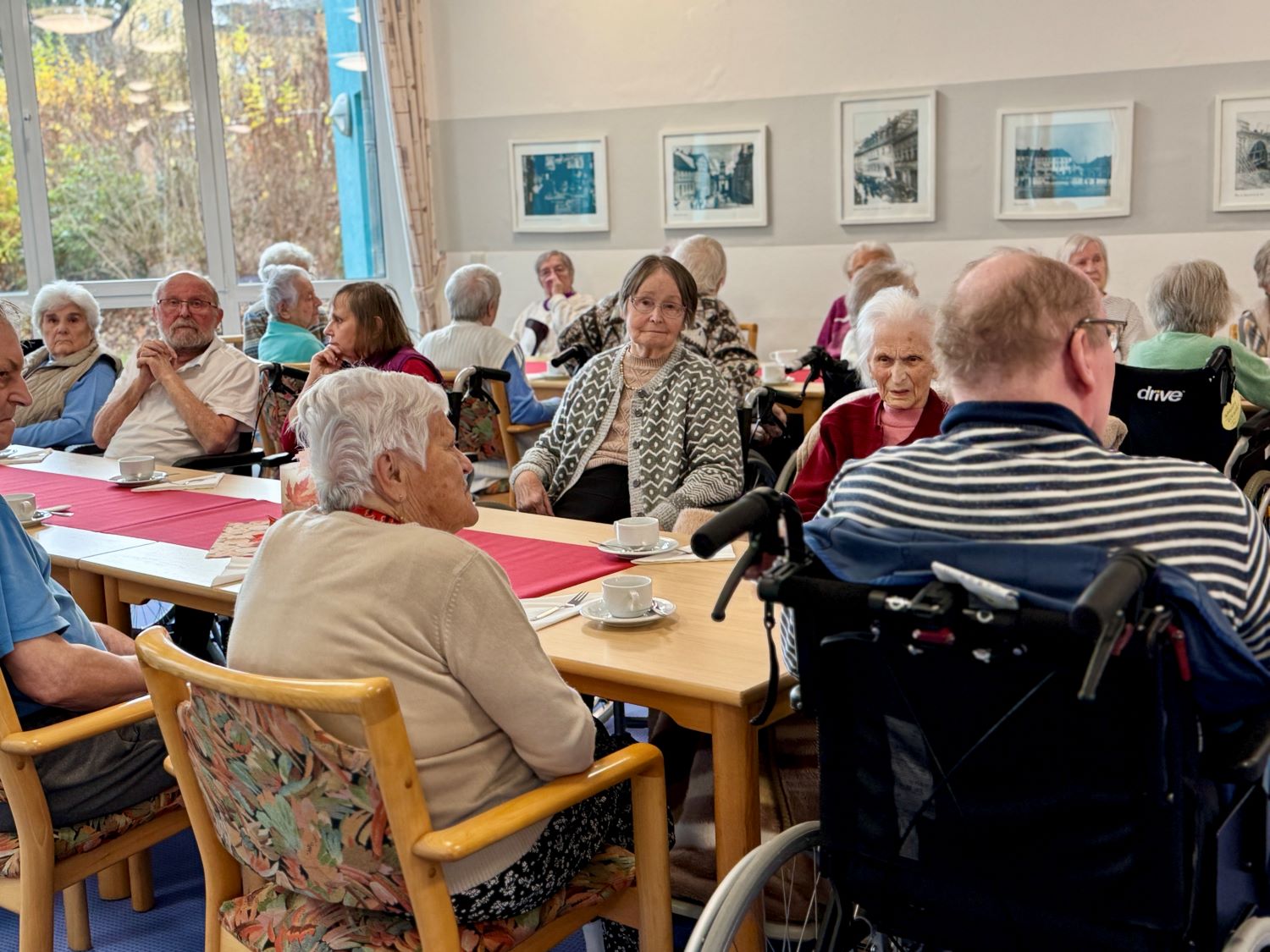 Für das leibliche Wohl war ebenfalls bestens gesorgt. Der Duft von frisch gebrühtem Kaffee erfüllte den Raum, und die Bewohnerinnen und Bewohner konnten sich an einer reichhaltigen Auswahl an köstlichen Kuchen bedienen. Die gemütliche Kaffee- und Kuchenrunde bot den Gästen die Gelegenheit, miteinander ins Gespräch zu kommen und gemeinsam den Moment zu genießen.