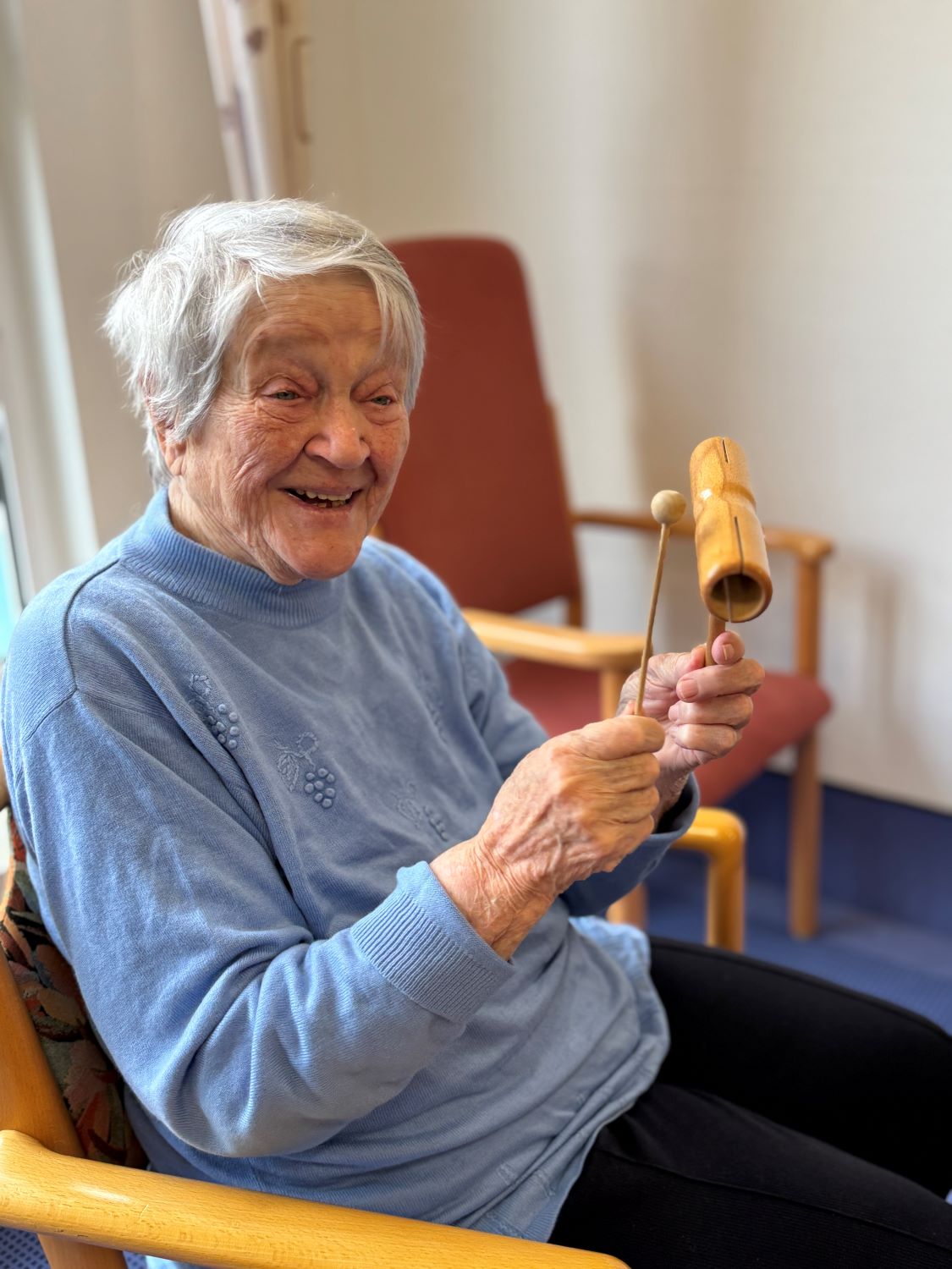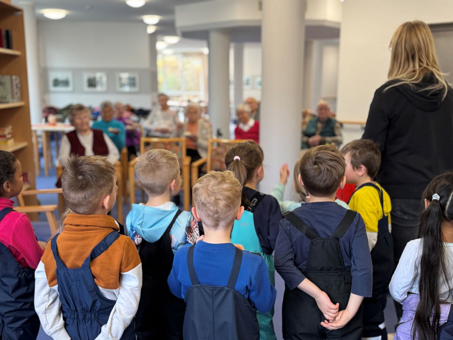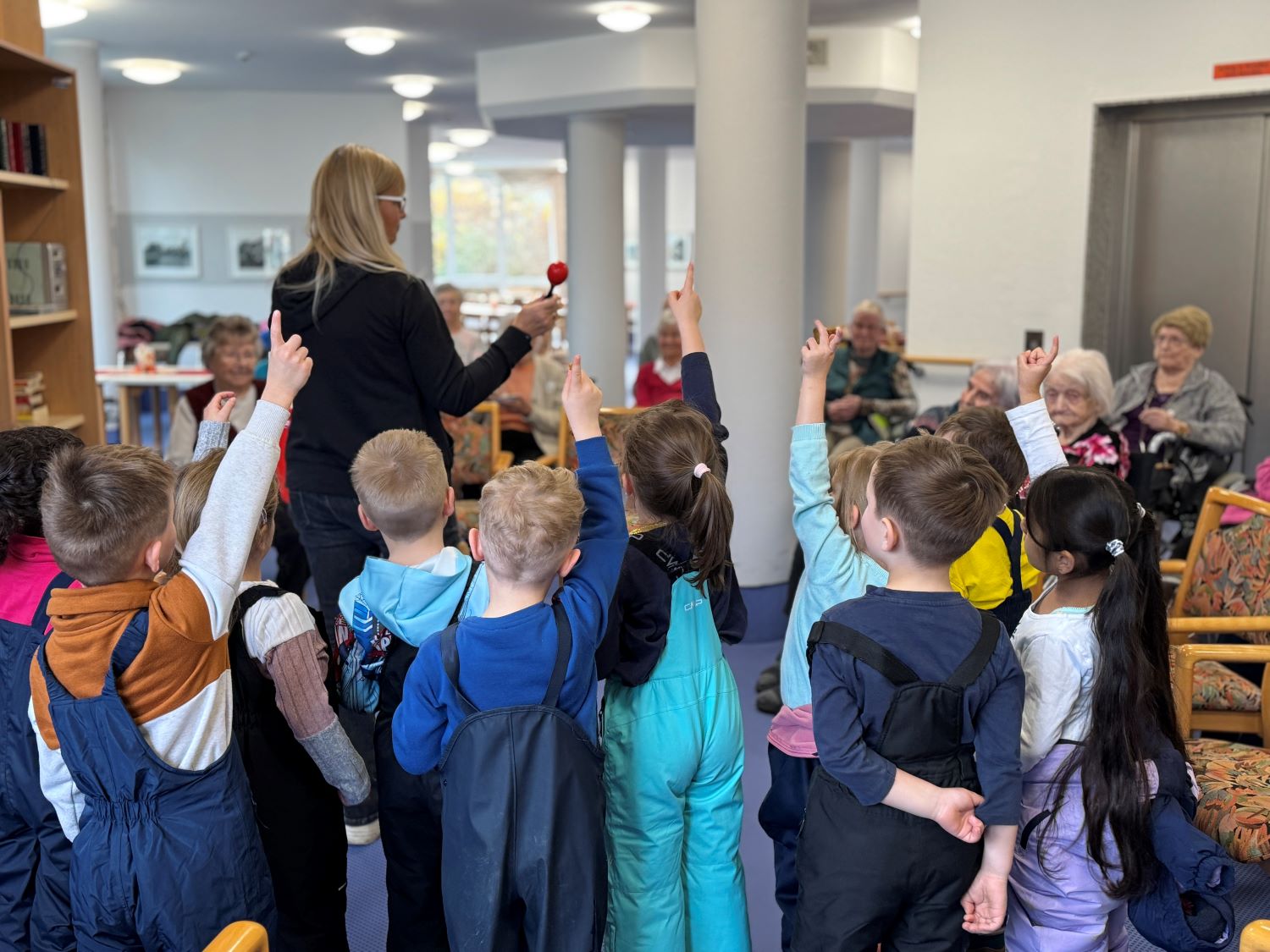 Im Anschluss verteilten die Erzieherinnen des Kindergartens kleine Instrumente an die anwesenden Seniorinnen und Senioren – Rasseln, Klanghölzer und Trommeln brachten schnell Schwung in den Raum. Gemeinsam mit den Kindern wurde musiziert und fröhlich gesungen. Aus dem Vorlesen wurde ein kleines generationsübergreifendes Konzert, bei dem alle mitmachten, lachten und den Moment genossen.