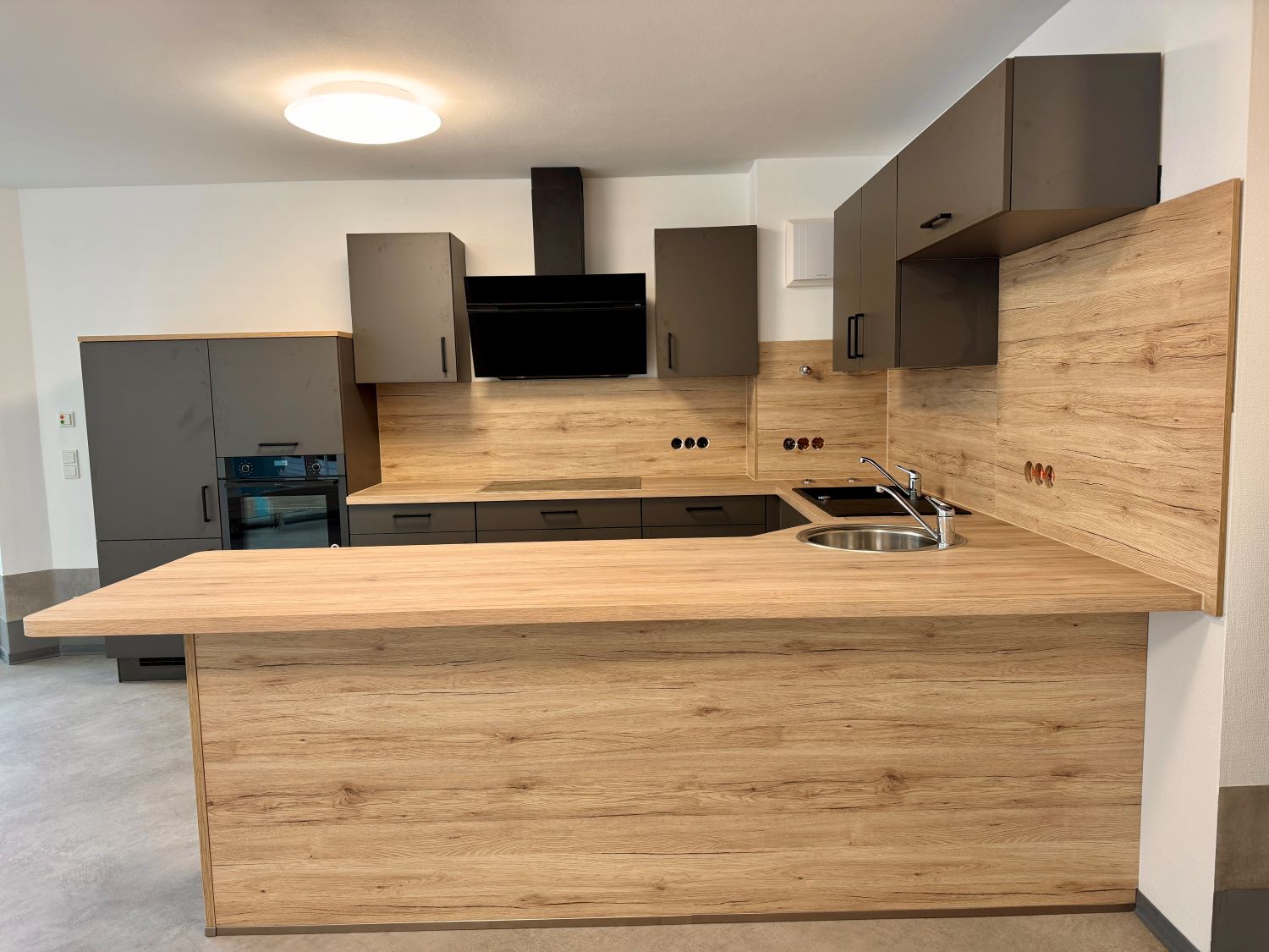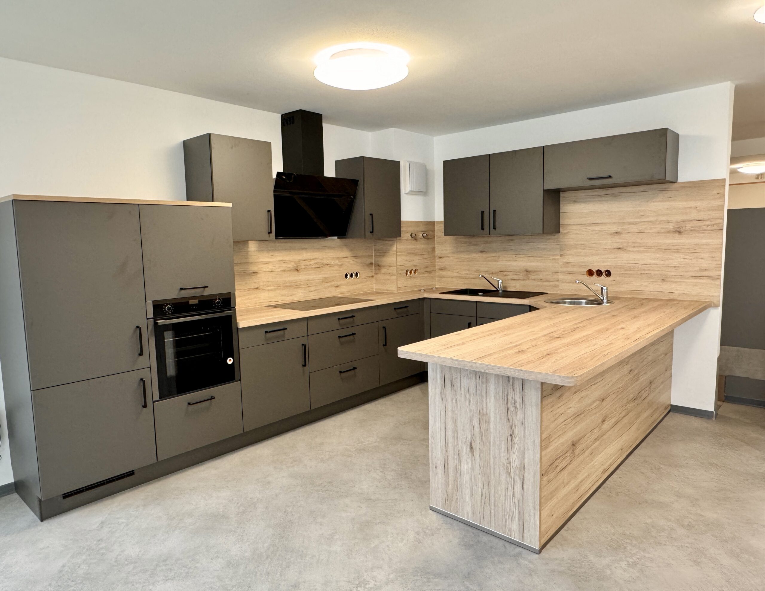 Warmes Holz kombiniert mit modernen Farben und viel Tageslicht schaffen eine freundliche Atmosphäre, in der man sich sofort wohlfühlt. Die hochwertige Ausstattung – von ergonomischen Arbeitsflächen bis zu gut erreichbaren Geräten ermöglicht Küchenarbeiten in direkter Nähe zur Bewohnerin / zum Bewohner, lädt zum gemeinsamen Zubereiten kleiner Speisen ein und macht auch das einfache Beisammensein besonders angenehm.